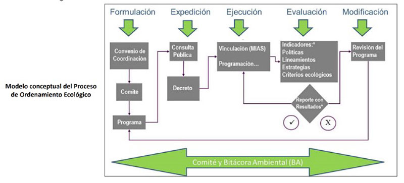 El Proceso de Ordenamiento Ecológico, es el conjunto de procedimientos para la formulación, expedición, ejecución, evaluación y modificación de los programas de Ordenamiento Ecológico. La figura siguiente muestra el esquema general del proceso de ordenamiento ecológico, mismo que se explica posteriormente: